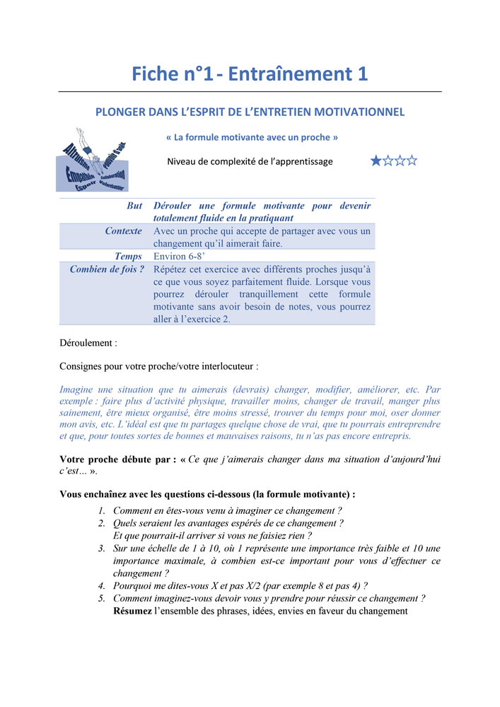 Vous immerger dans l’esprit de l’Entretien Motivationnel en testant une série de questions utiles pour faire réfléchir votre interlocuteur. Nous nommerons cet outil la « formule motivante ».